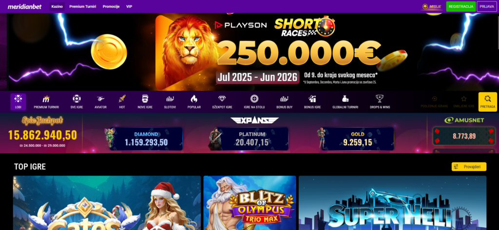 MeridianBet je među prvim kazinima koje ljudi u Srbiji uzmu u obzir jer je napravljen da radi glatko od prvog klika. Ulazak u kazino je jednostavan, meni je čist, igre se otvaraju brzo i nema lutanja po sajtu. Čak i ako si nov, za par trenutaka si na ruletu, blekdžeku ili slotu koji ti je zapeo za oko.